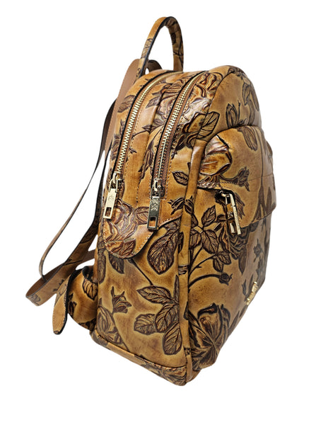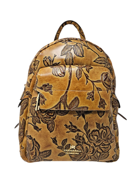 Zaino in cuoio stampato. La meravigliosa trama a rose che caratterizza la linea Mimì è impressa a fuoco su pellami di eccellenza dopo un lungo ed articolato processo ad oltre tredici livelli di lavorazione. Il complesso sistema di concia eseguito a mano con metodi artigianali assicura la straordinaria resistenza della tinta e la particolarità cromatica di sfumature, punti e striature che risultano caratteristici ed irripetibili.
